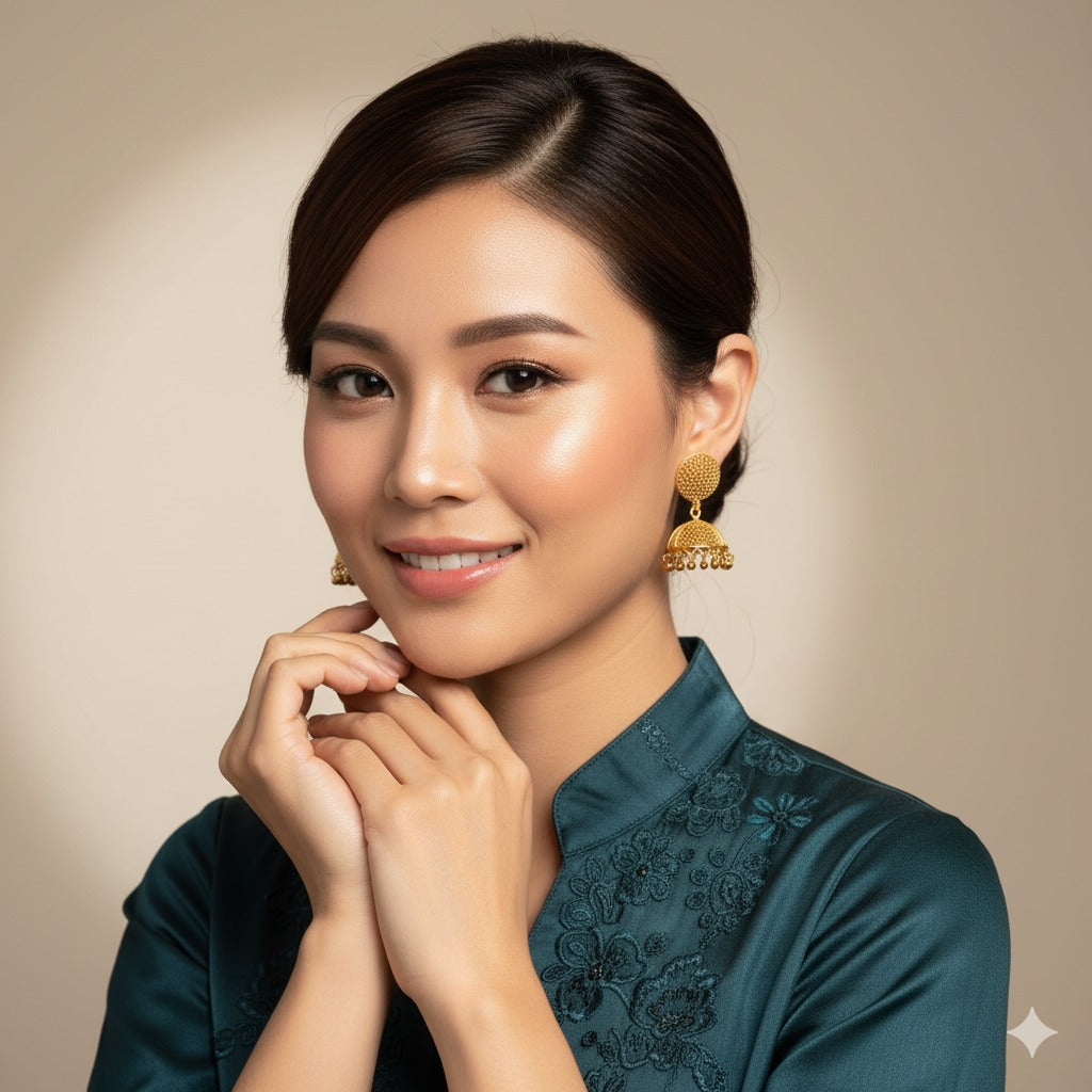 🔔 Graceful Movement: The jhumka’s bell-inspired silhouette adds fluidity and rhythm, making it perfect for festive occasions and celebrations.