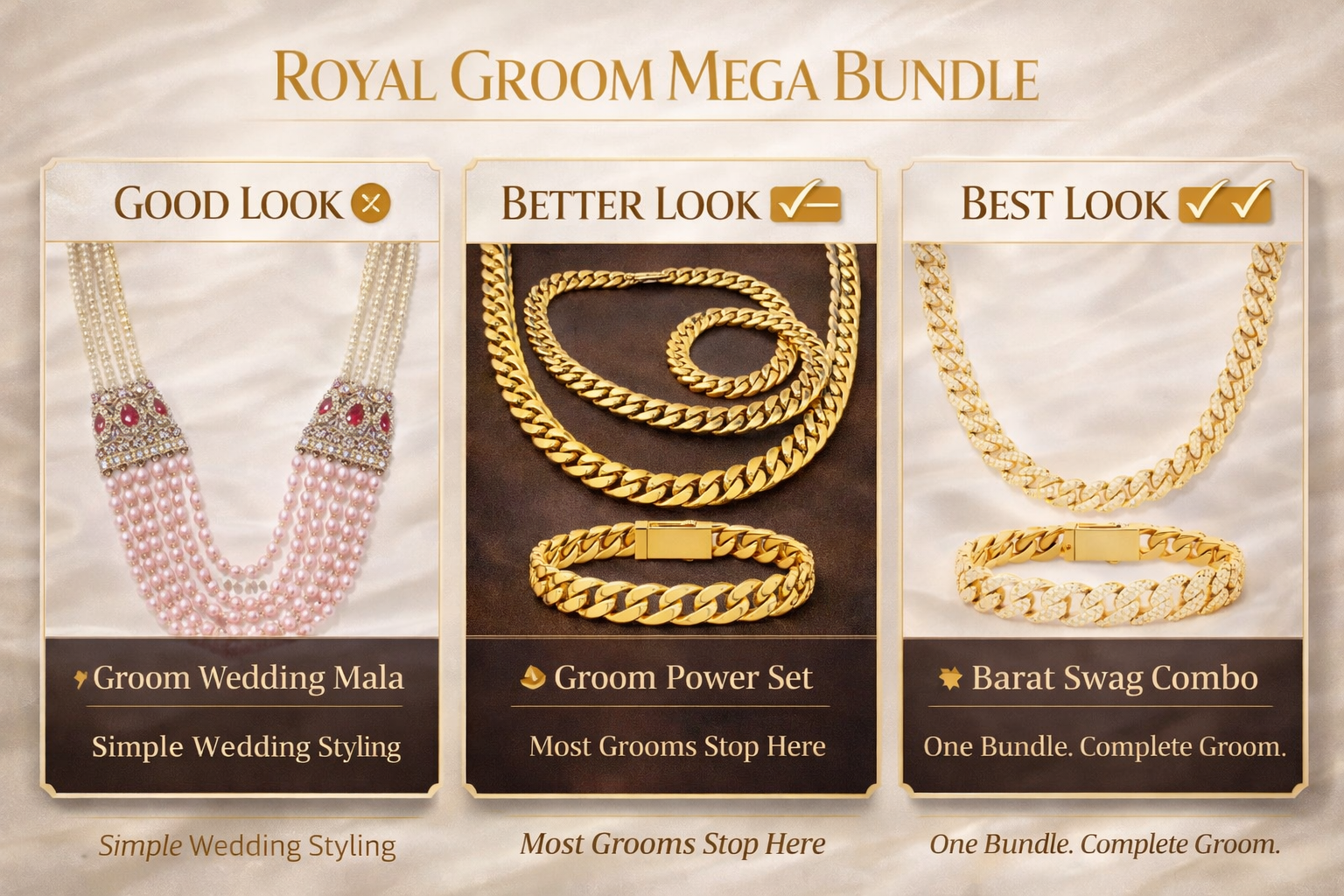 Command attention on your big day with the ROYAL GROOM MEGA BUNDLE by RICH RAPPERĀ® ā a complete, head-to-toe luxury jewelry set designed for grooms who want nothing less than a royal presence.